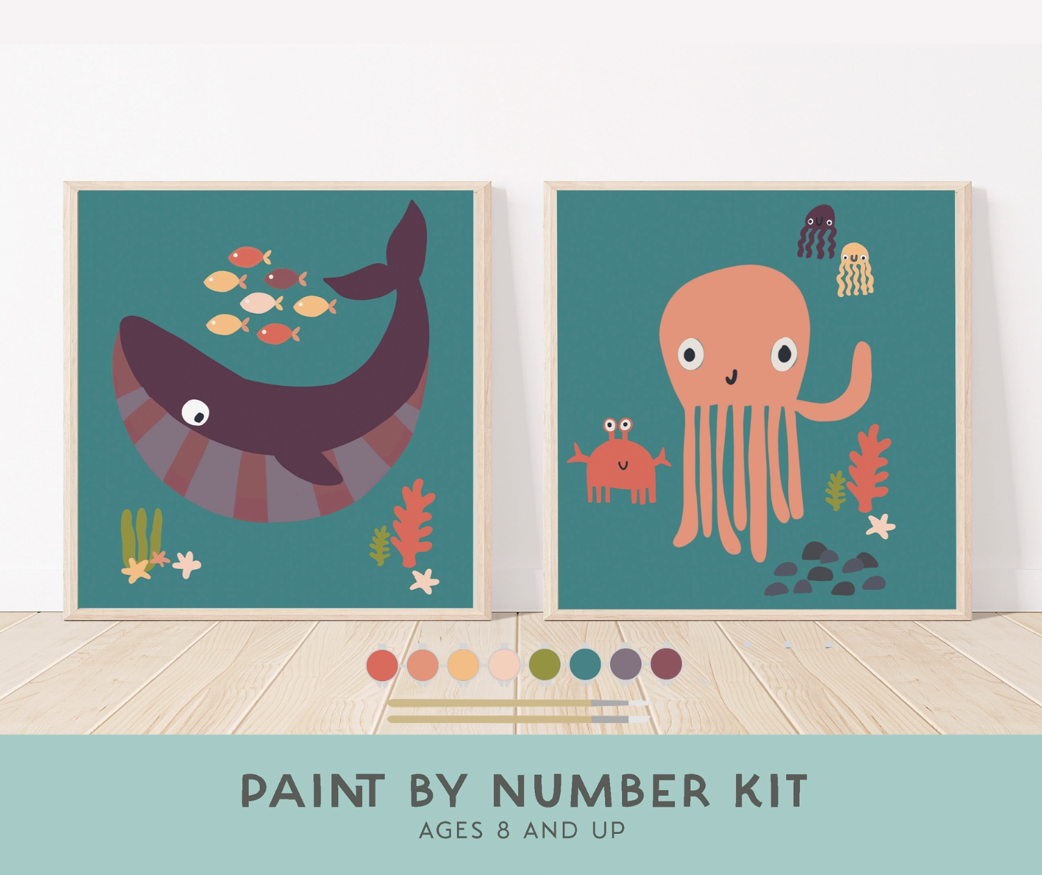 Introducing this set of two 8x8”" Paint by Numbers Kits for children, designed to unleash unplugged creativity and foster mindfulness and well-being in young minds. Each kit comes complete with two unique 8x8” high-quality canvas paper, two natural wood paint brushes, acrylic paint pots and painting instructions and tips. And to top it off, the box turns into a travel easel!