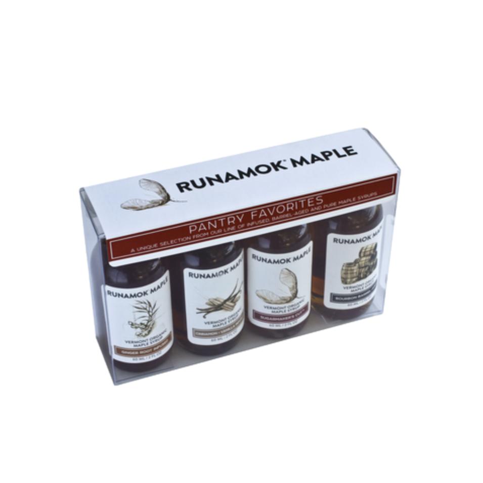 Contains: 60ml bottles of Ginger Root Infused Organic Maple Syrup, Sugarmaker's Cut Organic Maple Syrup, Bourbon Barrel-Aged Organic Maple Syrup and Cinnamon+Vanilla Infused Organic Maple Syrup.