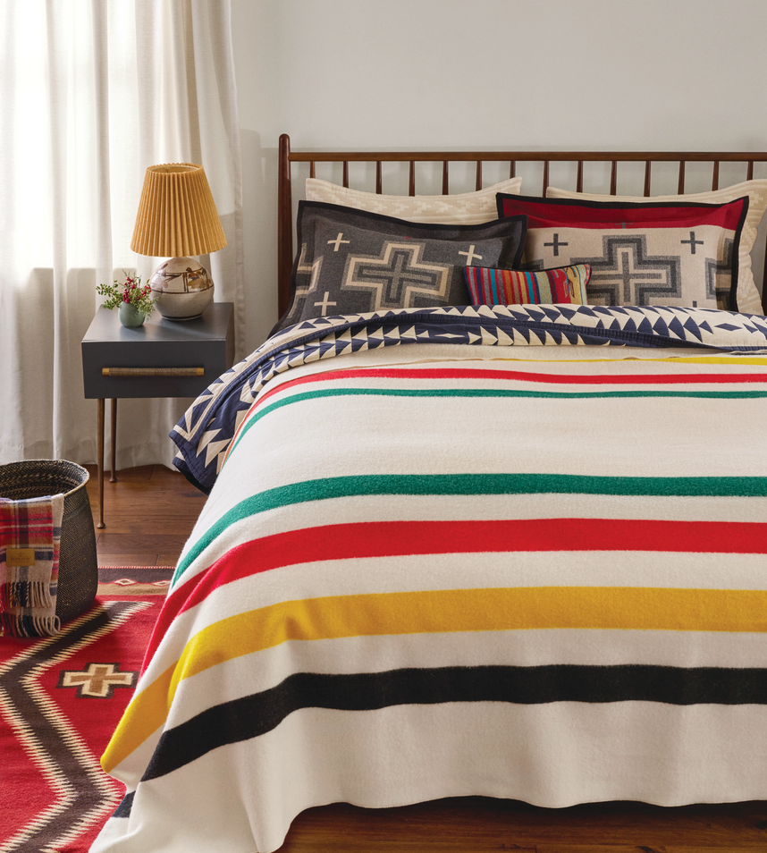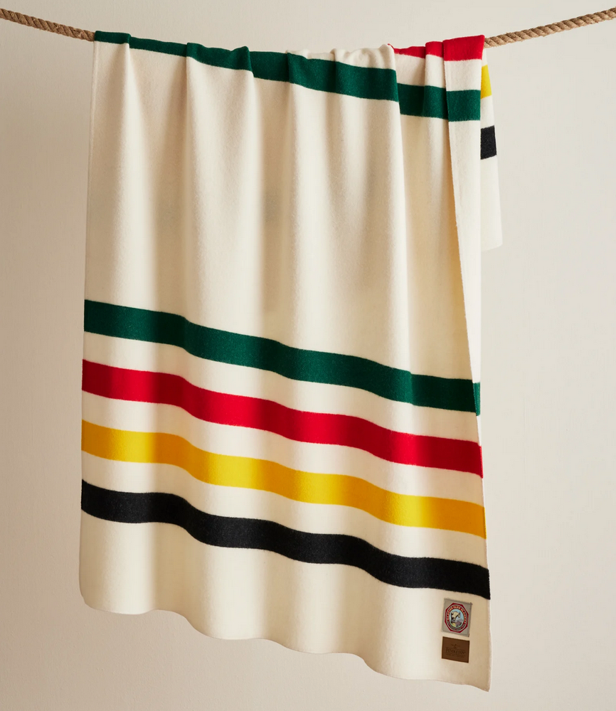 Since the early 1900s, Pendleton Woolen Mills has honored America's National Parks with a collection of distinctive park blankets. Glacier Park National Park Blanket was one of the first. Its historic markings and colors date back to the frontier trading posts. Traders would indicate the weight of the blanket offered in exchange for furs by holding up one finger for each pound. The original blankets incorporated three, four or five black stripes in the design, which indicated the value of the blanket. Colors and variations of the original striped theme have been adapted to reflect distinguishing characteristics of each park and blanket in the collection. National Park Blankets are still woven right here in our Pacific Northwest mills, just as they were nearly 100 years ago.
