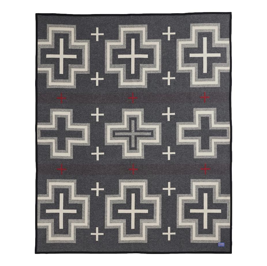 Bold crosses and minimalist colors are inspired by the influence of 19th century Spanish missionaries on Southwest weaving. Reverses from grey background to ivory for two dramatically different looks.