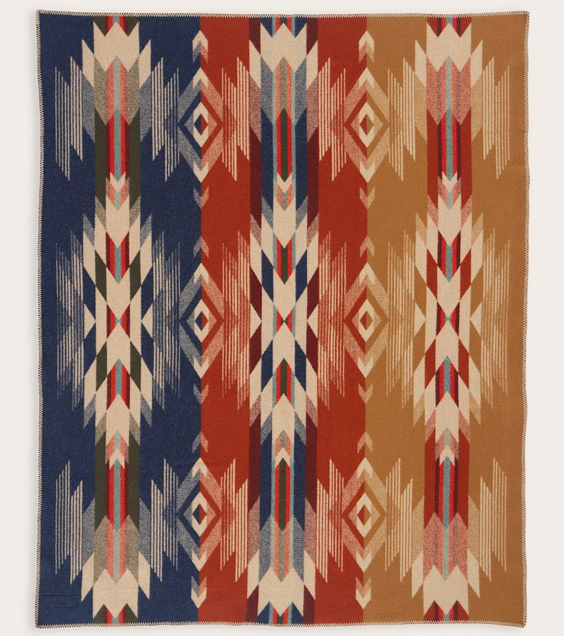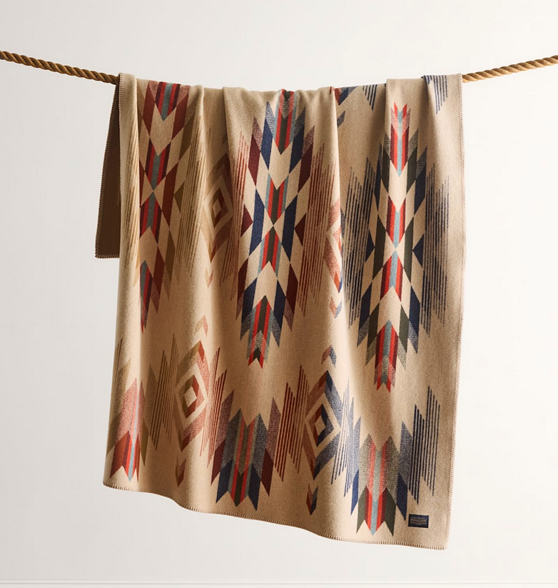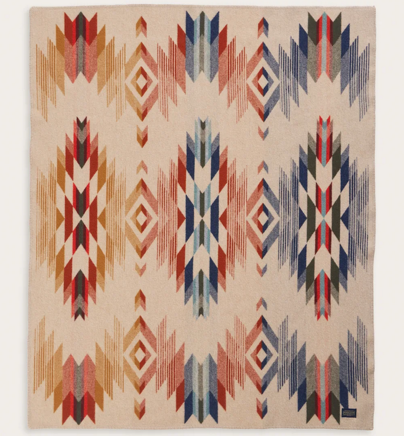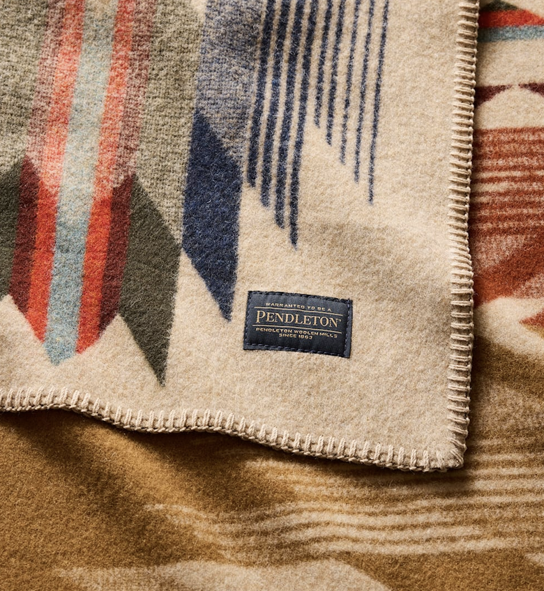 Showcasing a vibrant geometric pattern, the Wyeth Falls Throw brings a splash of color and warmth to any room. Woven in Pendleton's Pacific Northwest mills, it's both a functional blanket and a decorative piece.