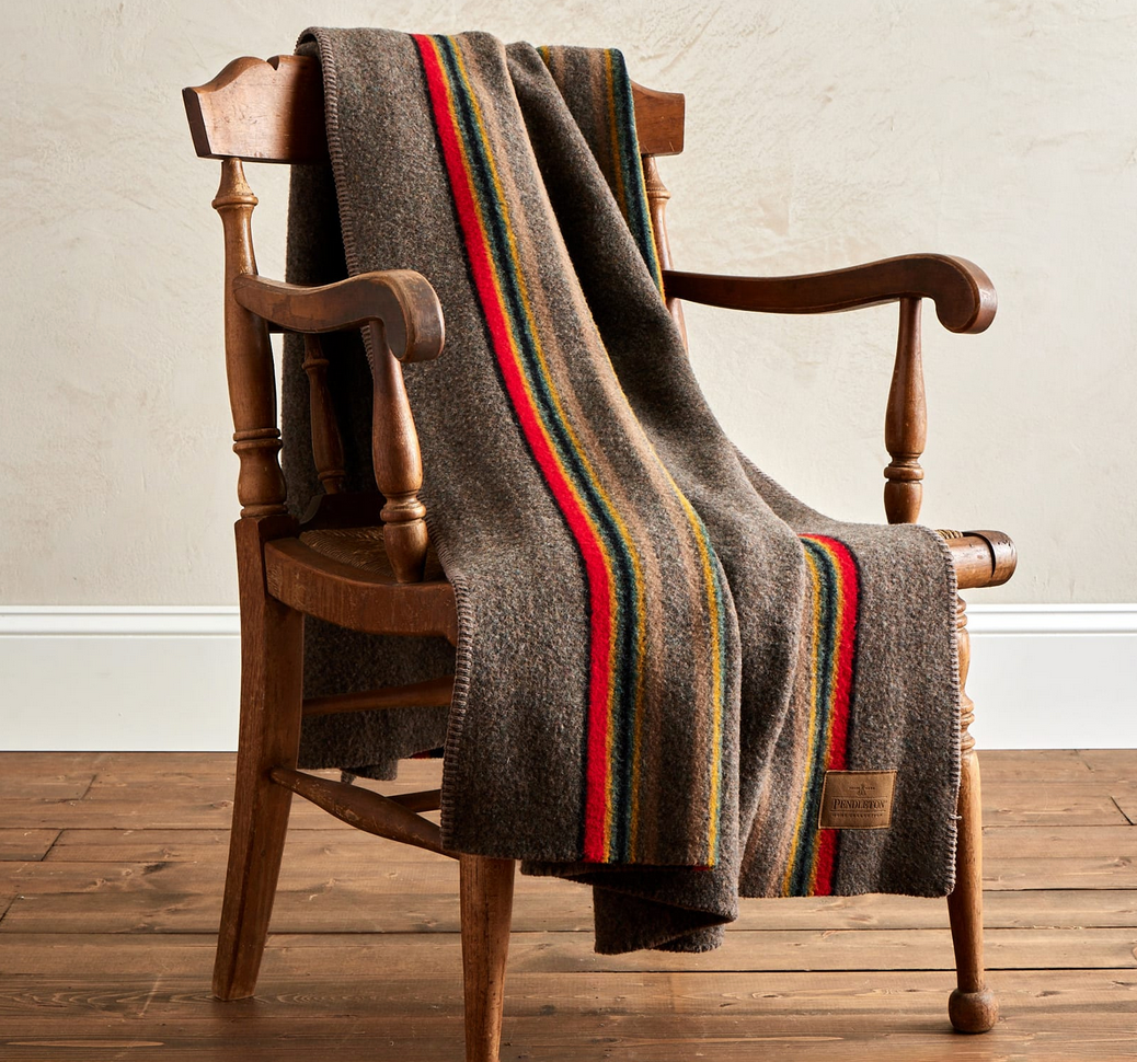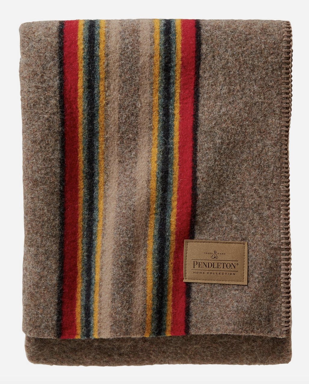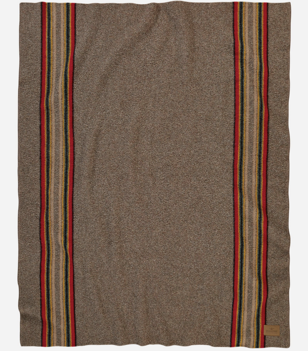 Made-in-America wool camp throw that's one of our most popular. Camp blankets were originally used by shepherds to brave the elements of the Pacific Northwest—right where our rugged wool versions are still woven today. These smaller sized blankets make a great gift for outdoor enthusiasts. Stripes run vertically.
