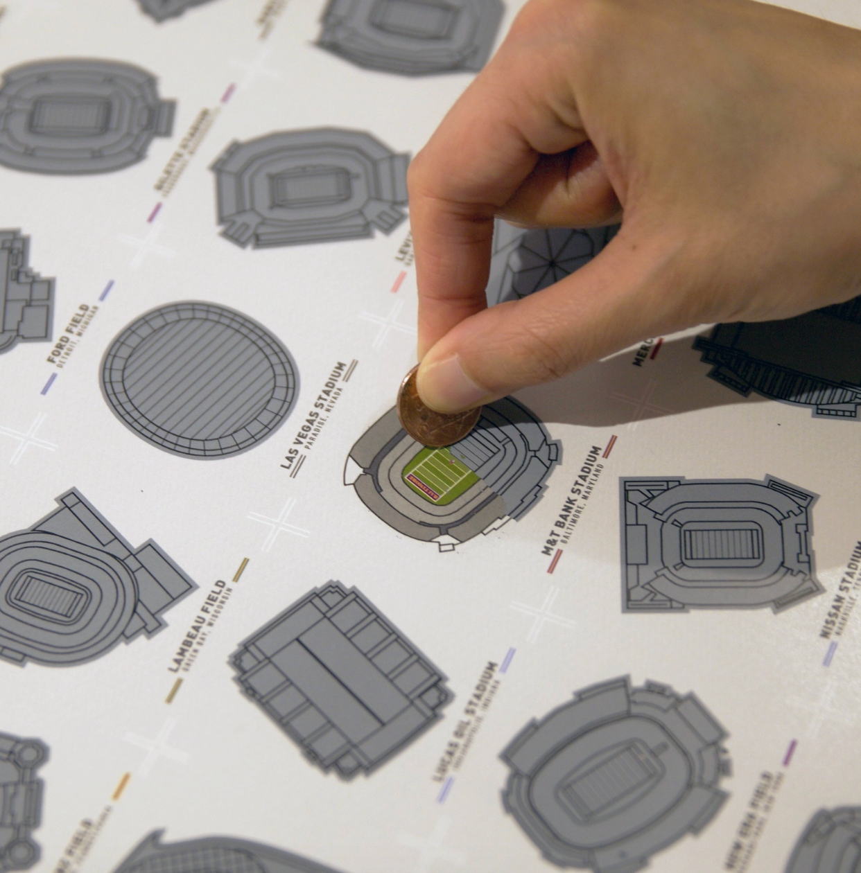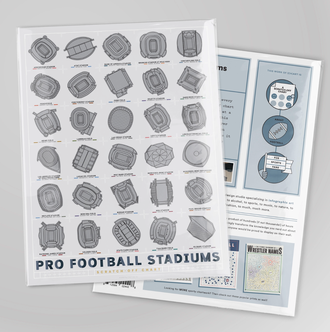 Tackle your “field goals” of visiting every football stadium with this scratch-off poster of pig-skin pilgrimages! After guesting at a gridiron, just take a quarter-back to this chart and lightly rub away the upper layer to unveil a full-color field illustration underneath. Buy one for yourself, or pass it off to any eligible receiver—it’s sure to earn you extra points.