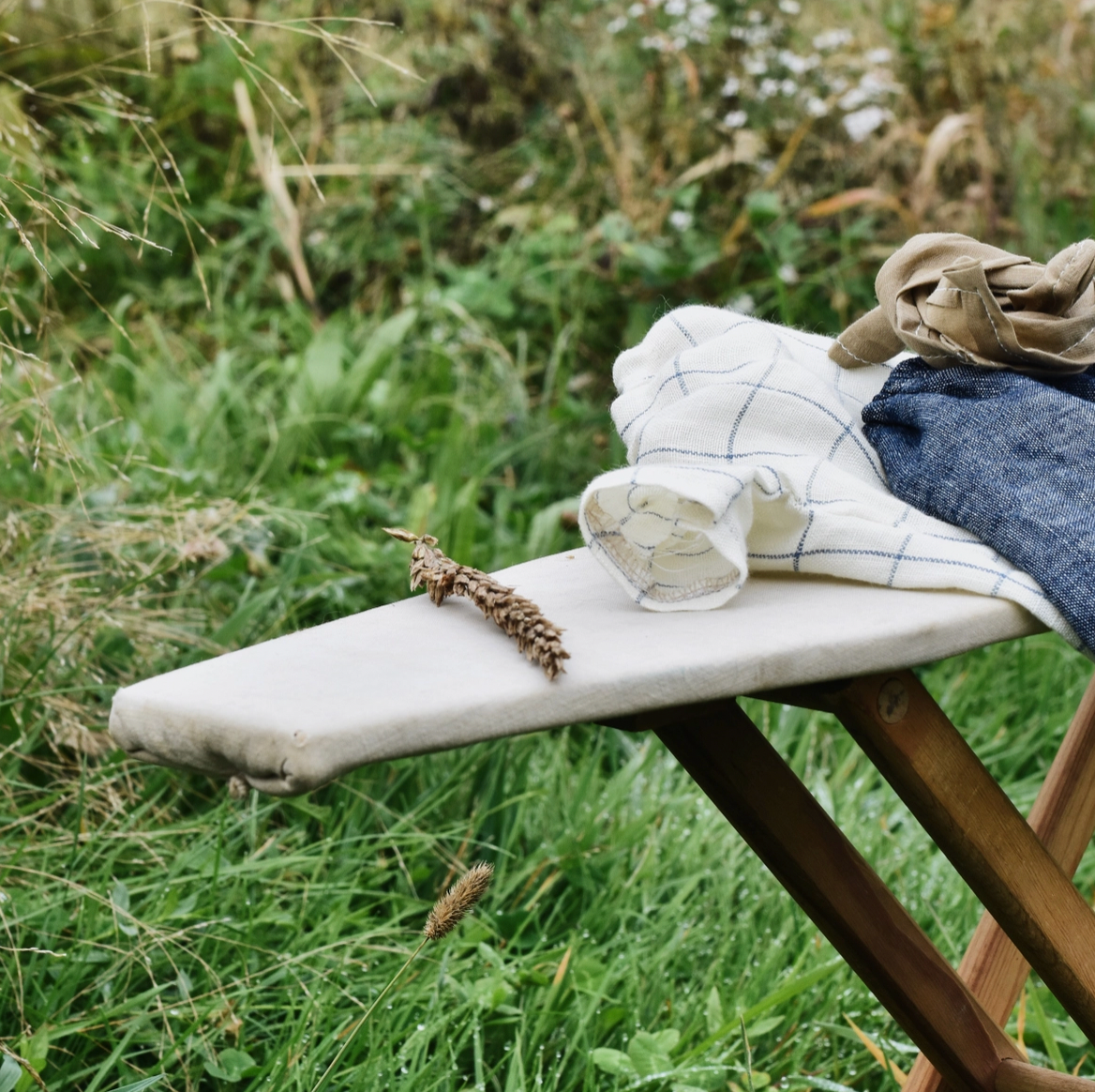 Ruthie is wearing her removable chambray skirt with a lightweight linen check top.
