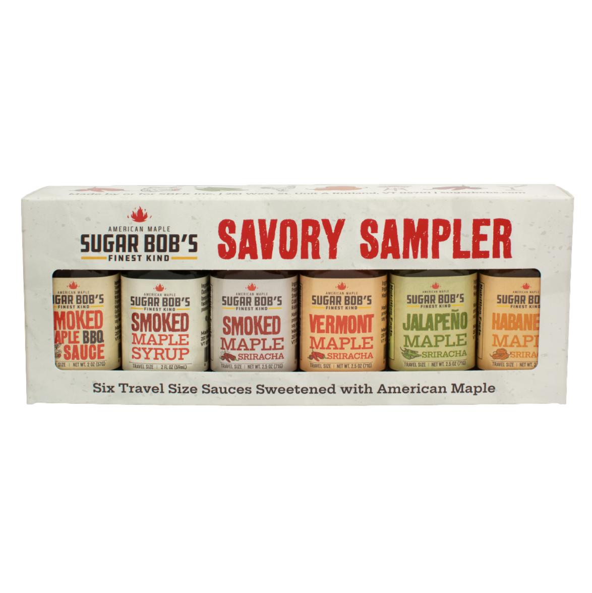 TSA Compliant Travel Size set of all of Sugar Bob's amazing products! Six two ounce bottles - Smoked Maple Syrup, Smoked Maple Barbeque, and the 4 Srirachas - Smoked, Original, Verde and Very Hot. Never any additives, preservatives, or flavor enhancers. Real ingredients = real flavor! Box is shrink wrapped for maximum gift appeal.