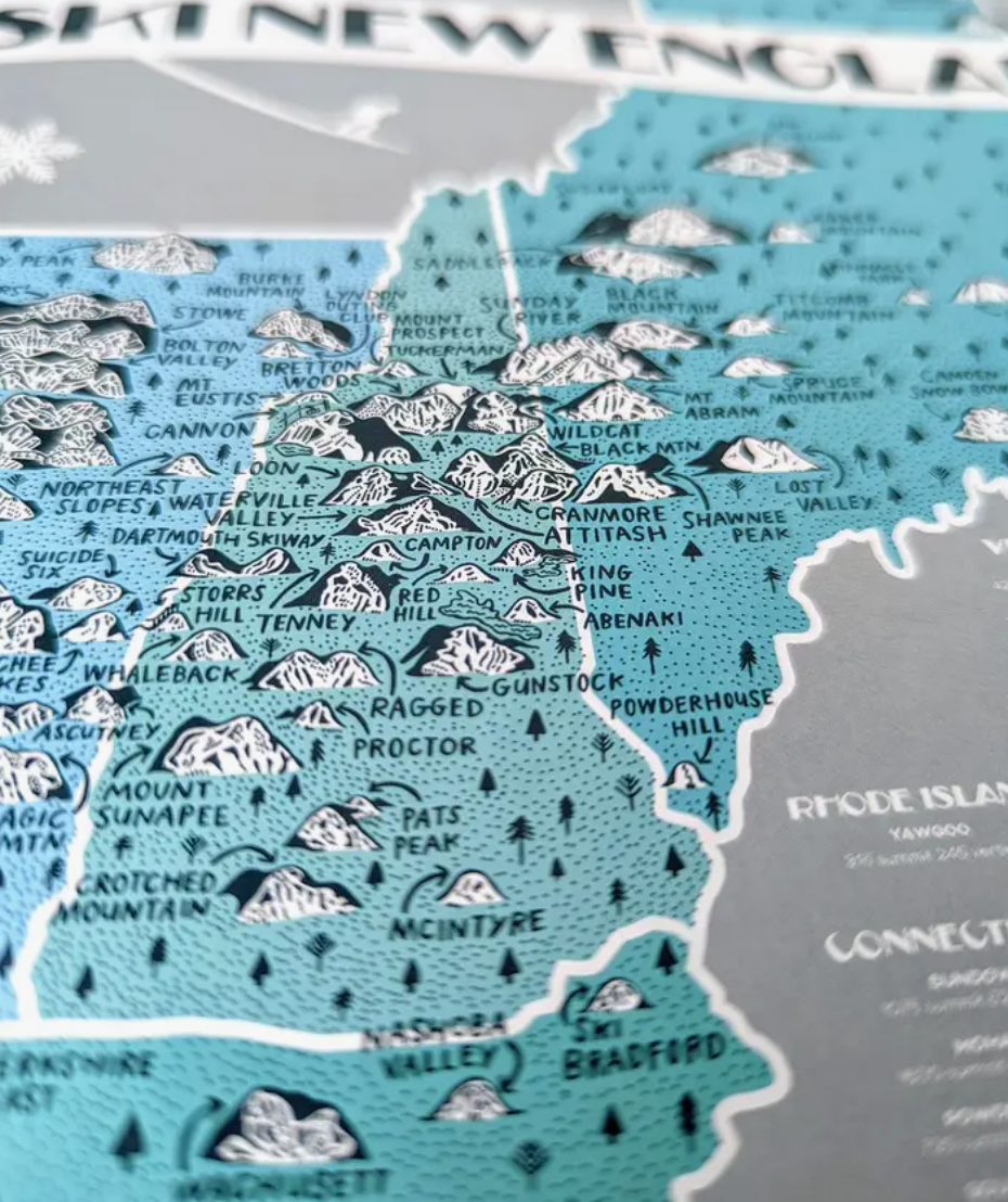 For all you skiers and riders out there who embrace the ICE COAST! This map has all your favorite peaks. A staple for every home or cabin in New England. A hand illustrated map to add to your ski and snowboard decor. Ride the mountains! Even though we snowboard, we still say "we're going skiing." Is that weird? We don't care.