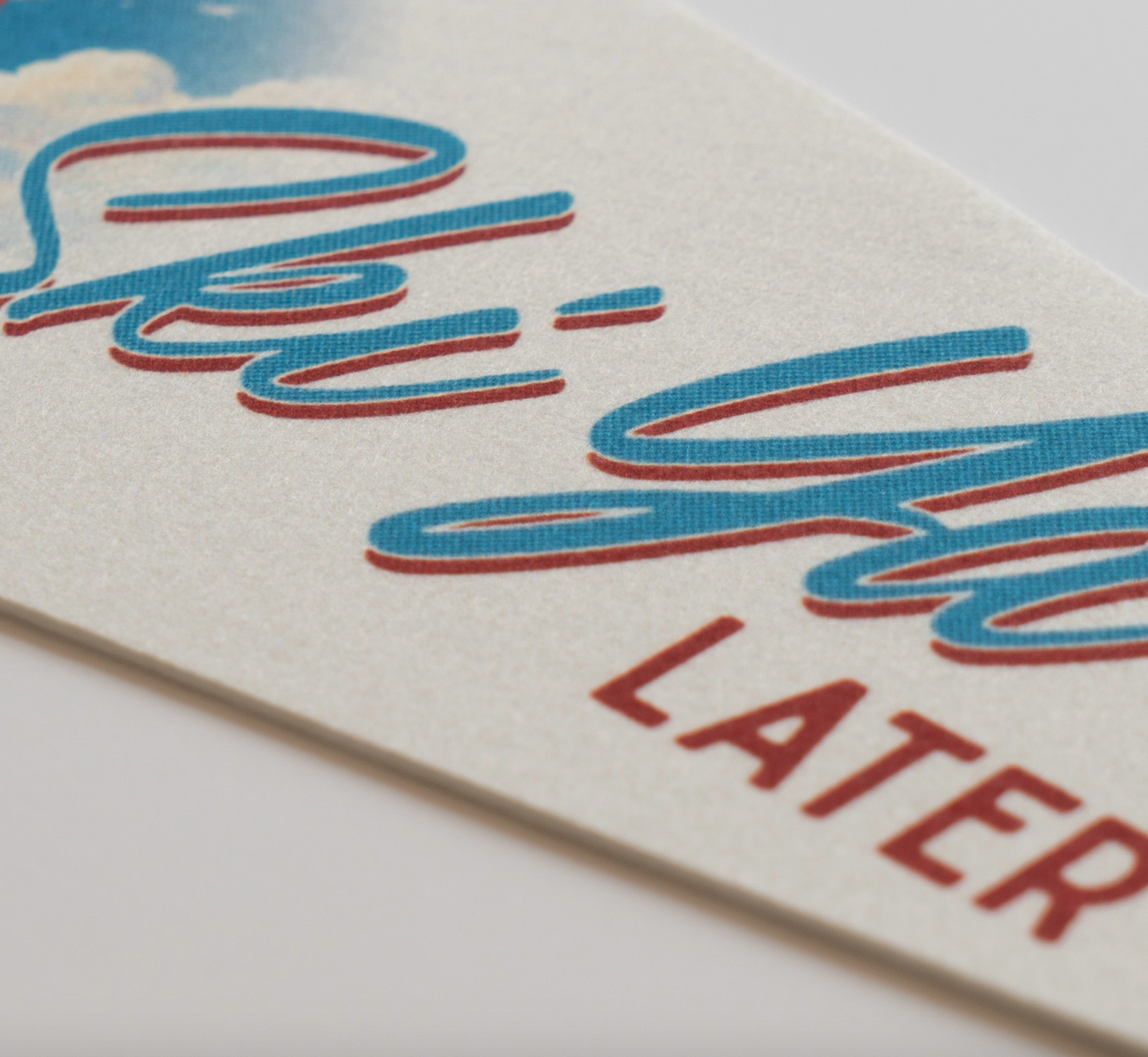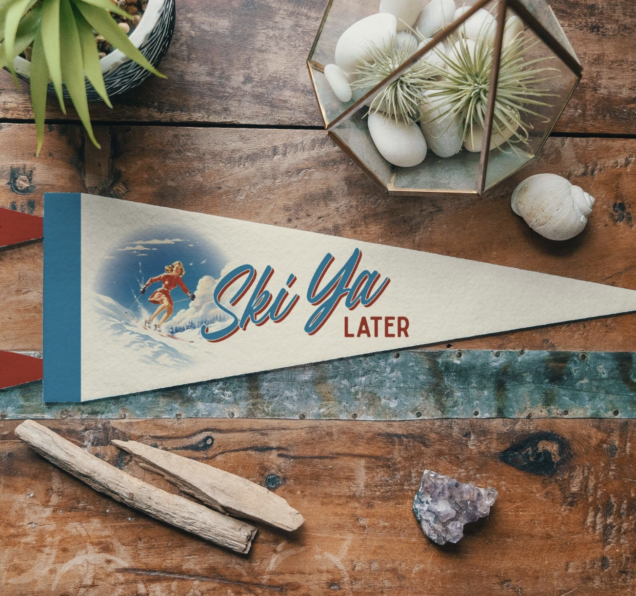 Take your ski decor to new heights with the Ski Ya Later Felt Pennant! This vintage-inspired pennant boasts classic typography and a playful "Ski Ya Later" message. Perfect for hanging in a mud room, cabin, or as a hilarious gift for your favorite skier or snowboarder. These pennants are made of one solid piece of fabric. The designs are printed directly onto felt, one at a time at a small shop in Maine, USA.