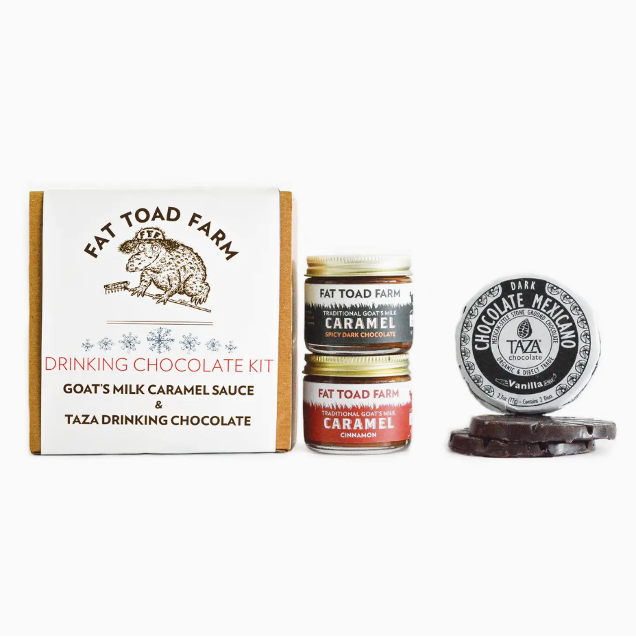 This Drinking Kit will warm you up on the coldest of winter nights. This decadent combo of Fat Toad Farm Spicy Dark Chocolate and Cinnamon Goat's Milk Caramel Sauces and Taza Stone Ground Chocolate come together to create the best drinking chocolate you have ever tasted. We hope you enjoy!