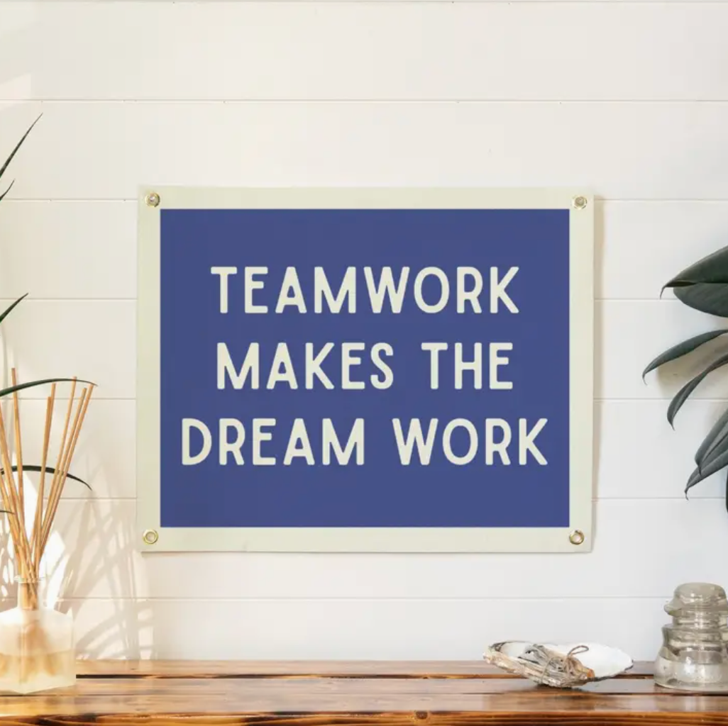 Step right up and behold the marvel of collaboration, the "Teamwork Makes the Dream Work" Felt Poster Banner! Crafted by hand in the spirited land of the USA, this banner is more than just decor; it's a rallying cry for unity, a playful nod to the magic that happens when we join forces and work as one. With its vibrant colors and retro flair, this vintage pennant flag doesn't just spell out an inspirational motto—it's a testament to the power of collective effort and shared dreams. Each stitch of this handmade masterpiece carries the warmth and care of its creator, making it a beacon of positivity and a tangible reminder that together, there's nothing we can't achieve.