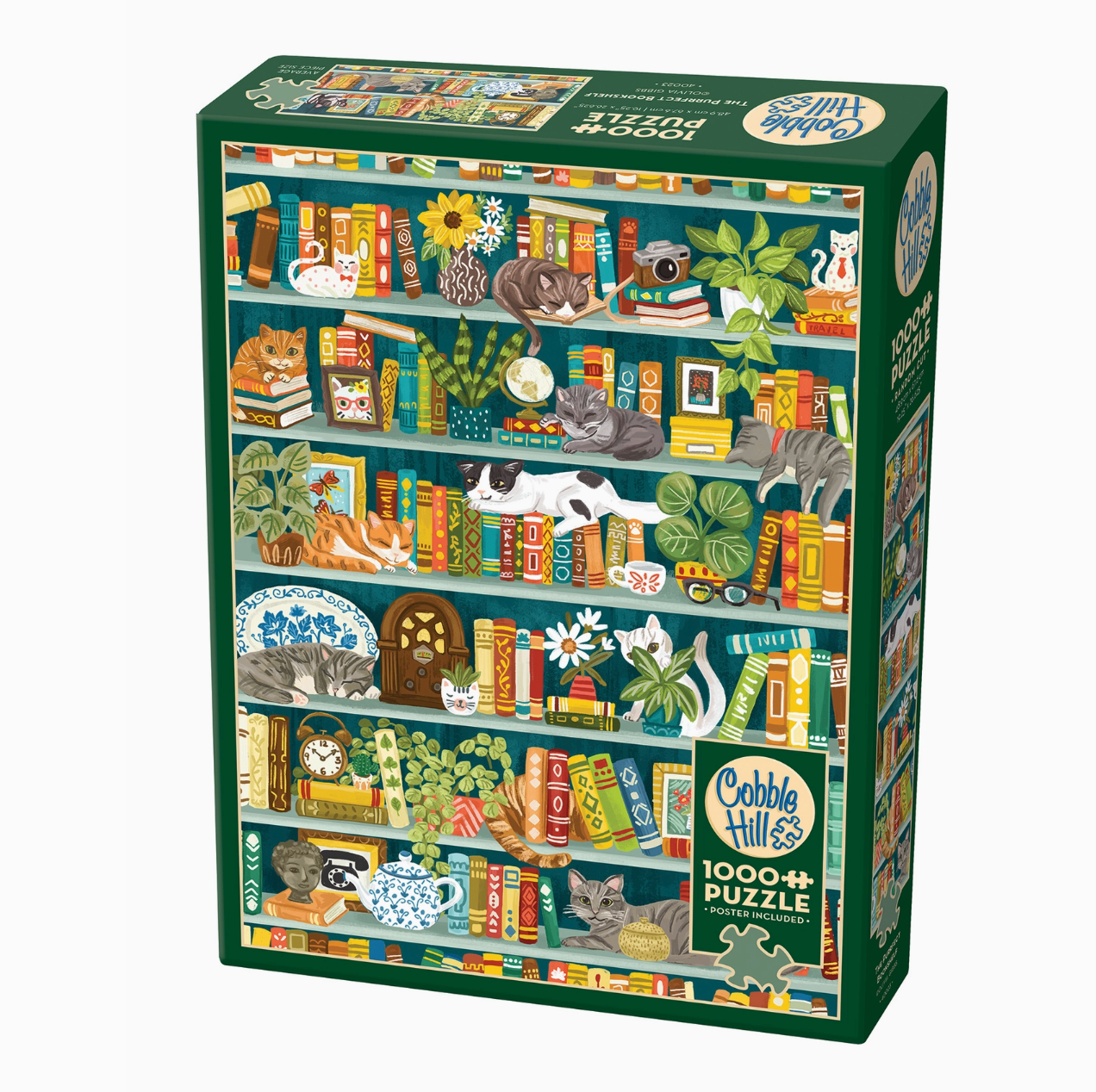 The Purrfect Bookshelf is displayed with colorful books, a plethora of plants, and of course - cozy cats!! It's a wonder that they haven't knocked down the world globe, teapot, or old-school alarm clock! But we see one cute kitty hiding behind a plant, ready to strike - is this 1000 pieces of calmness or chaos?