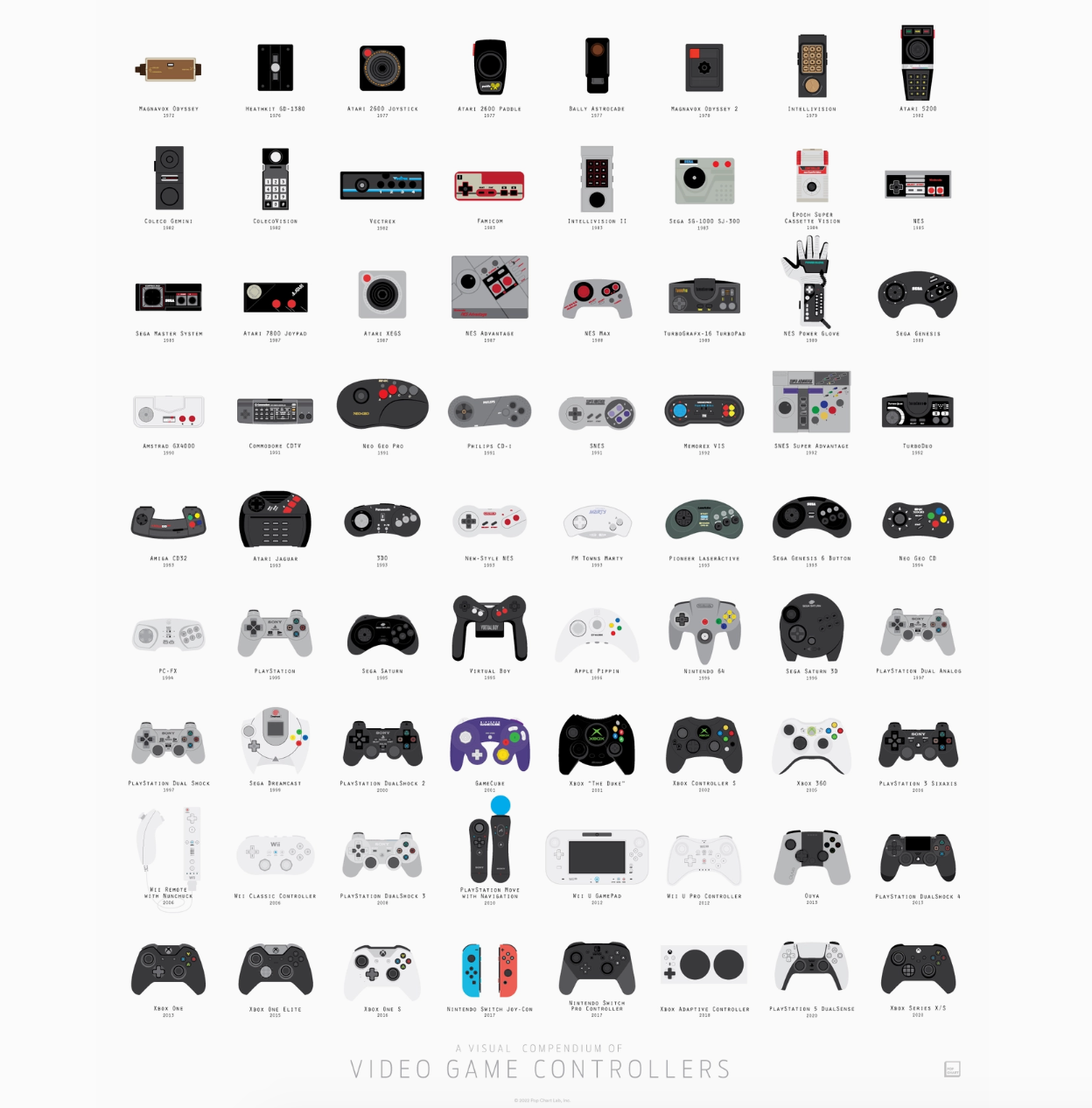 This visual compendium of video game controllers delineates all manner of input implements from the iconic Atari 2600 joystick through the coveted PS5’s feature-filled DualSense. This curated collection of console controllers is sure to power up your wall decor.