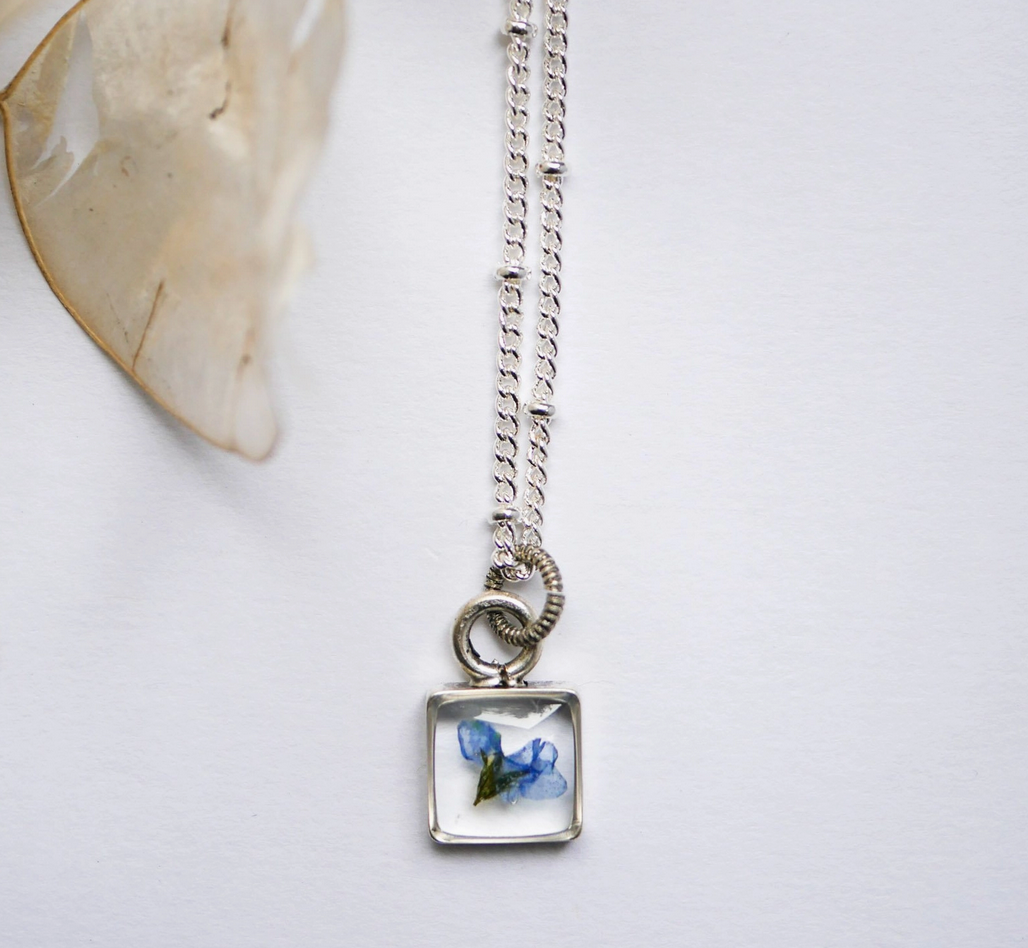 The Tiny Square frame is a minimal and classic piece. Available with either a Coral Bell or a single Forgetmenot flower.