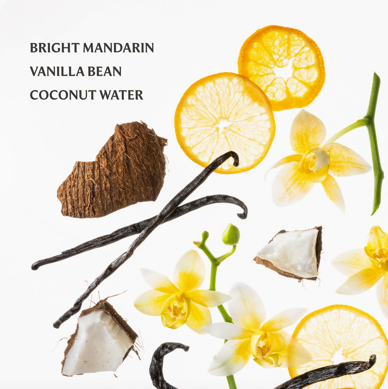 Vanilla Blossom Scent: Warm and serene. Bright mandarin and coconut water intertwine with vanilla bean, enveloping you in the peaceful calm of a sunlit afternoon.
