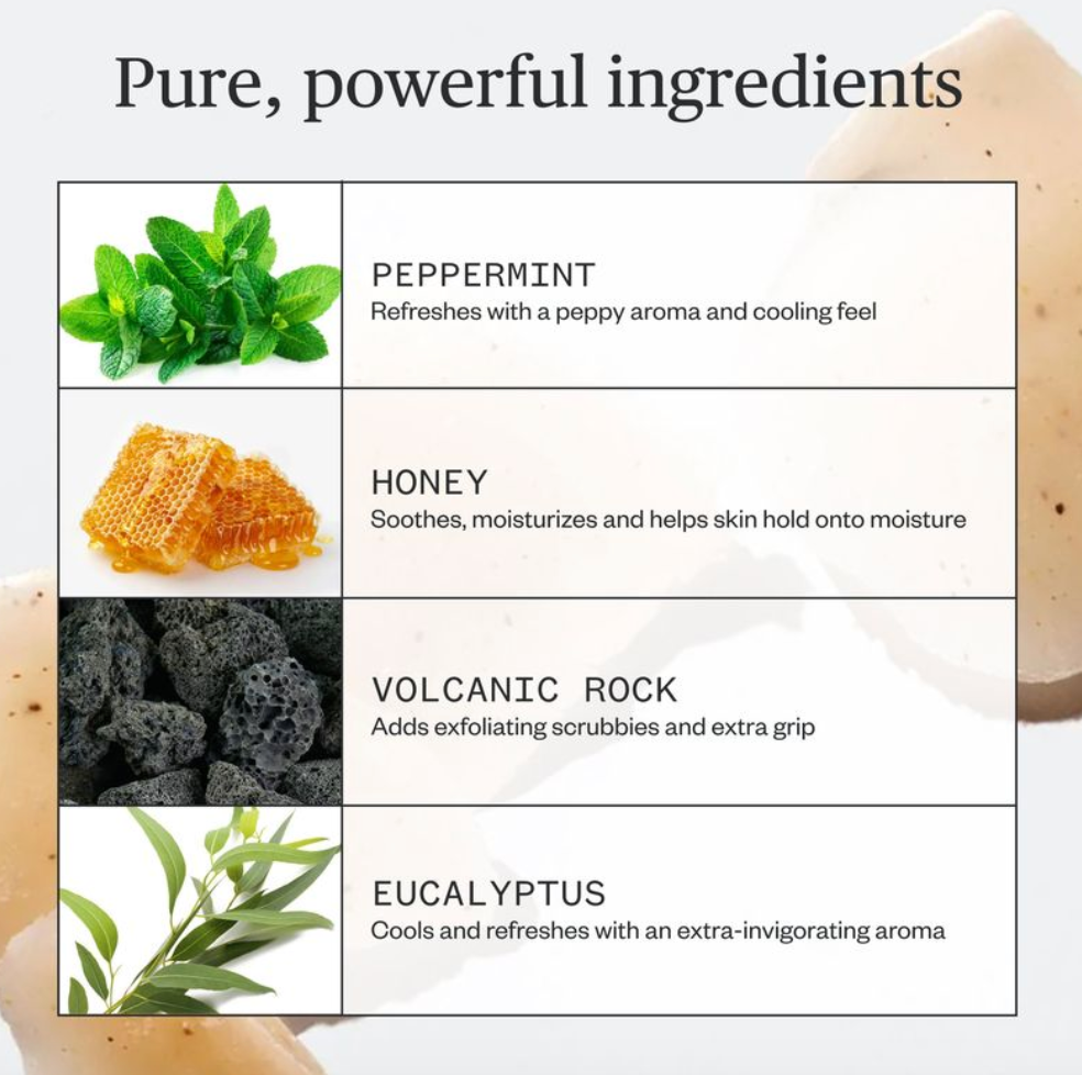 Peppered with small bits of Volcanic Rock that add scrubby exfoliating properties—plus extra grip!