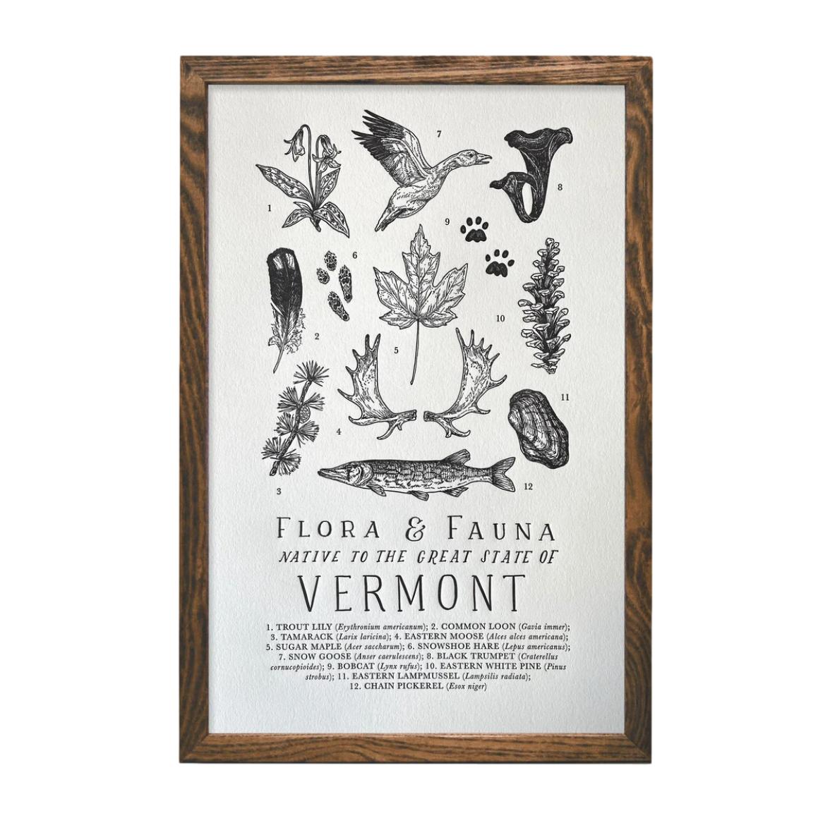 A hand-illustrated letterpress chart detailing flora and fauna native to the Great State of Vermont. This chart features wildlife including sugar maple, chain pickerel, and eastern moose.