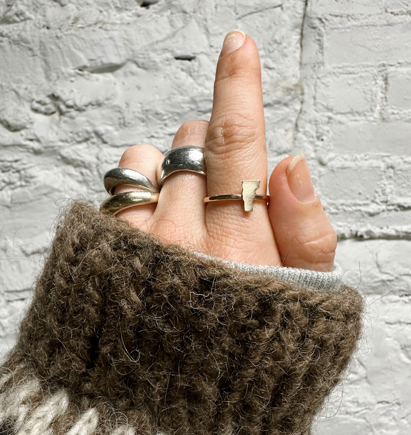 Embrace the Vermont pride of with this meticulously handcrafted state ring. The petite state silhouette is artistically hand-cut from radiant 14k gold-fill. Then, with a touch of alchemy, it's soldered to a textured gold-filled band, making it a dream for stacking enthusiasts!