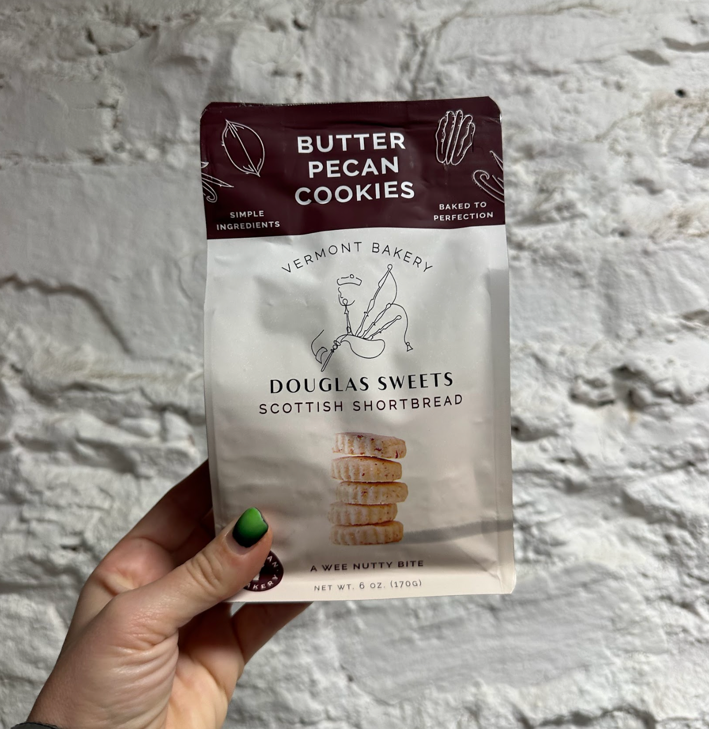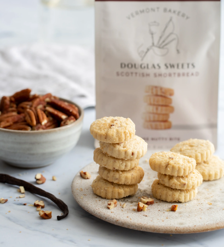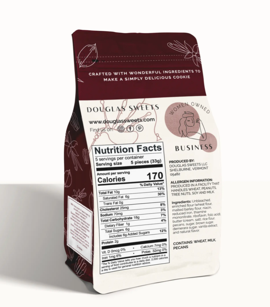 Pecan shortbread cookies with a rich warm vanilla flavor. It's as cozy as it gets for cookies. The premium quality butter is used to ensure a delicious flavor and careful baking process offers a light crisp texture. These cookies are packaged in a beautiful resealable bag. Ingredients Unbleached, enriched flour (wheat flour, malted barley flour, niacin, reduced iron, thiamine mononitrate, riboflavin, folic acid), butter (cream, salt), rice flour, pecans, sugar, brown sugar, demerara sugar, vanilla extract, and natural flavor. Each bag contains about 24-26 cookies