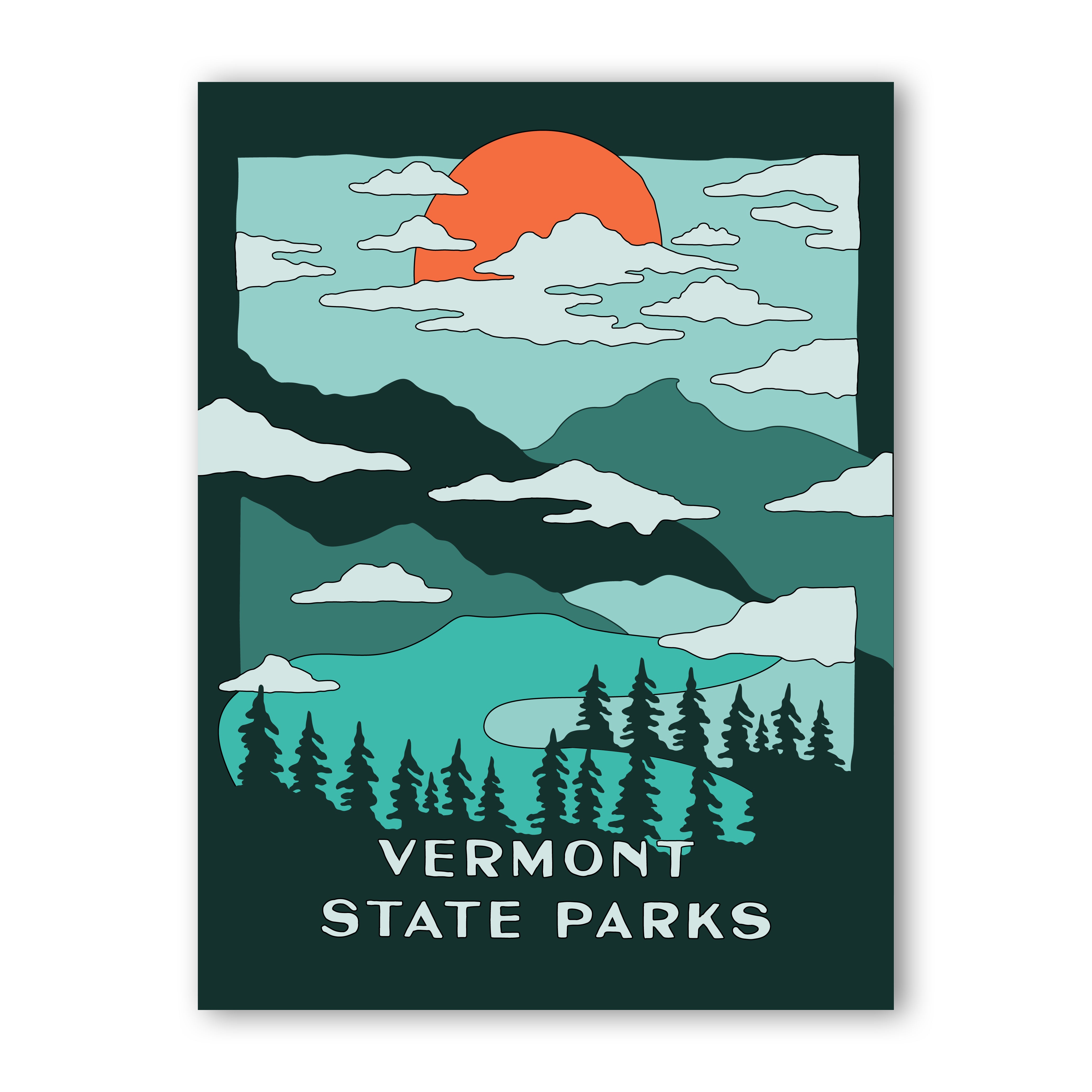 For the print collection, Common Deer works with area artists and graphic designers to create art that represents that amazing state park. Look for new releases throughout the year! In fall 2019, 7 parks and 7 artists were featured in the initial launch of the project. Help us celebrate the parks by tagging your posts of the collection with #vtparkscollection and @commondeer!
