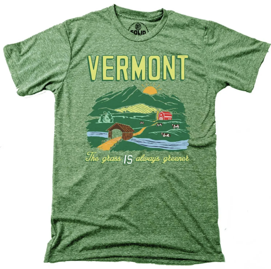 For anyone whose been fortunate enough to spend some time in the Green Mountains of Vermont, they realize pretty quickly, that the grass, LITERALLY is greener here. This super cool tribute t-shirt to the great state of Vermont is ethically sourced in the USA, and printed with eco friendly ink right here in Burlington, VT.