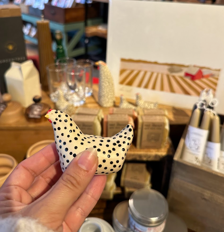 Cluck Cluck! This ceramic spotted chicken figurine is made in Vermont. Each figurine is handcrafted and one of a kind, so each will differ slightly from the photo.