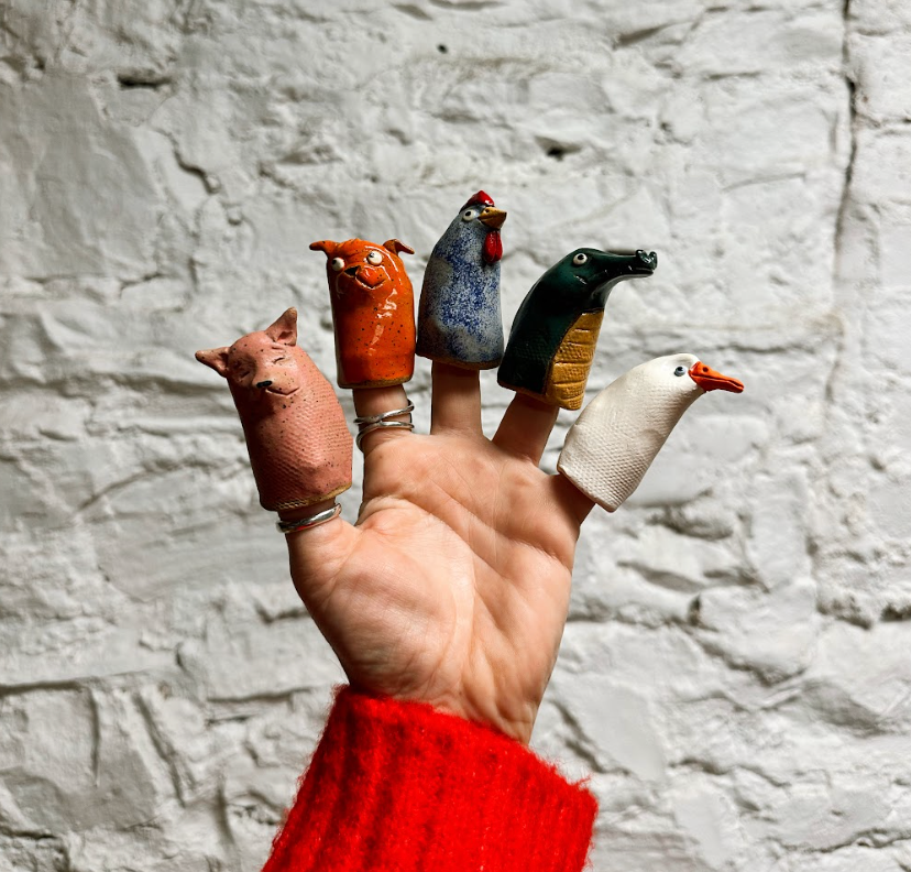 One of a kind lil' ceramic figurine, with a unique personality. Each lil' buddy is handcrafted and one of a kind, so each will differ from the photo-- who you receive will be a surprise! Yes, they can be worn as ceramic finger puppets.