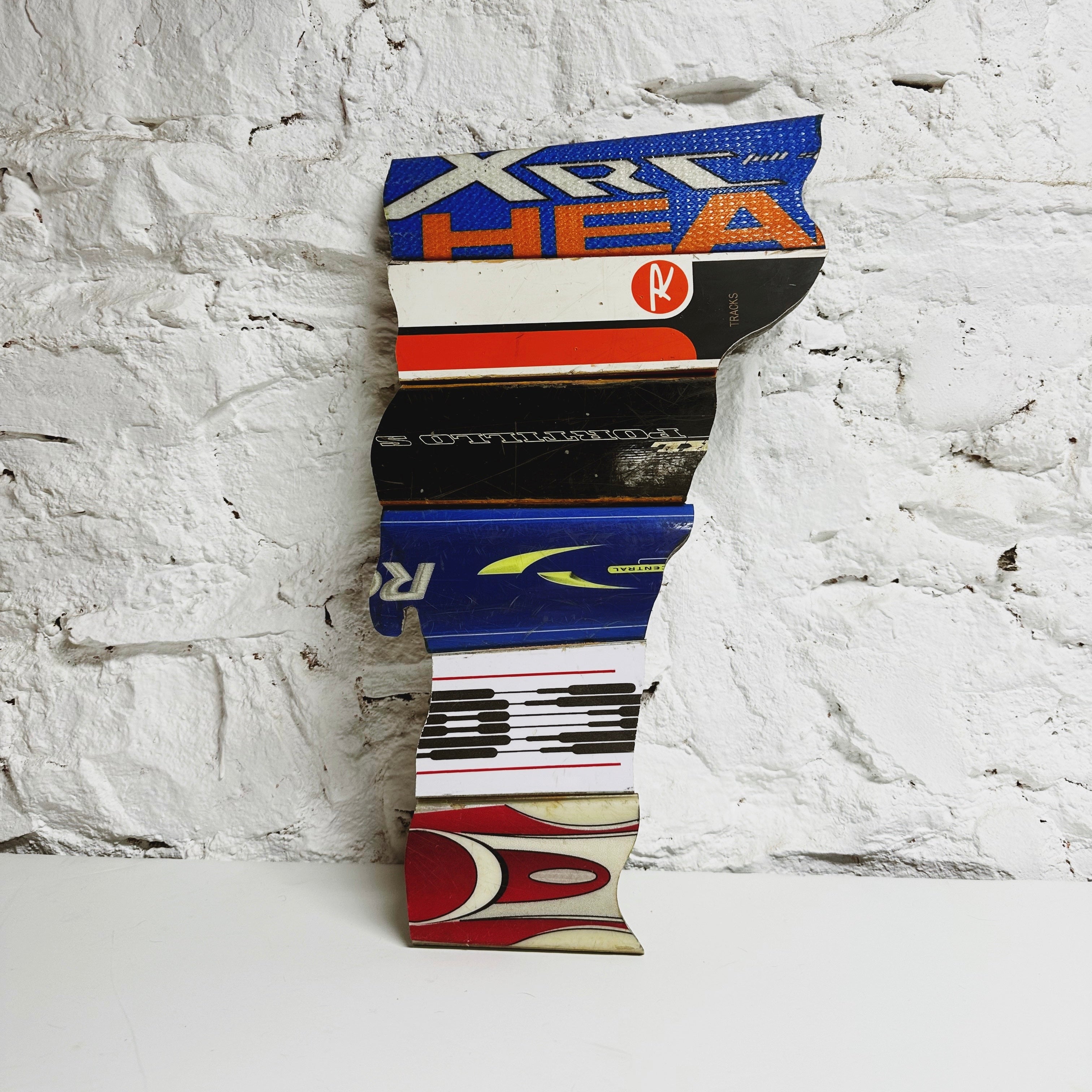 Celebrate the Green Mountain State with this one-of-a-kind unique wall hanging, made from vintage skis. Each one is one-of-a-kind, so while there is a general theme of blue, white, red, and orange, the one you purchase will vary from this image.