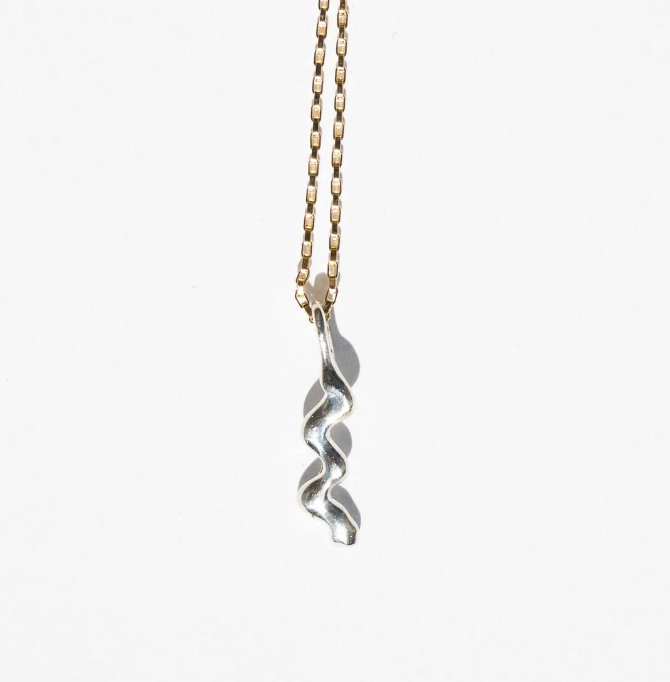A hand carved and cast sterling silver or brass pendant paired with a dainty gold filled 16" chain. Pendant is approx. ½” in length.