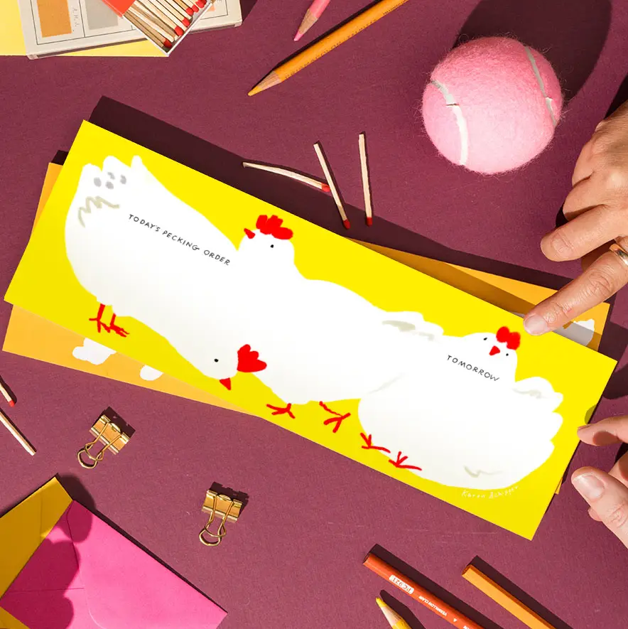 Chickens Desk Planner is a weekly desk planner pad featuring three cheerful hens and labeled sections like “Today’s Pecking Order” and “Tomorrow” — a punny planner that makes everyday organization feel light and fun.