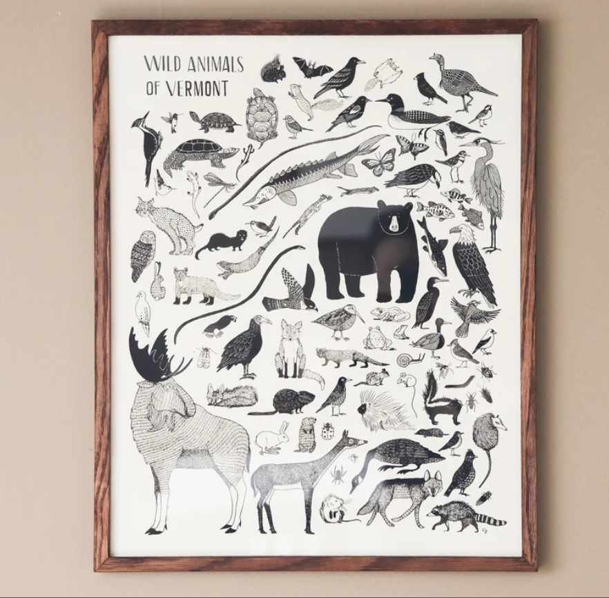 Wild Animals of Vermont (16"x20") consists of over 80 drawings of wild animals that all live in Vermont, USA. It's a celebration of the wild nature of the Green Mountain State.