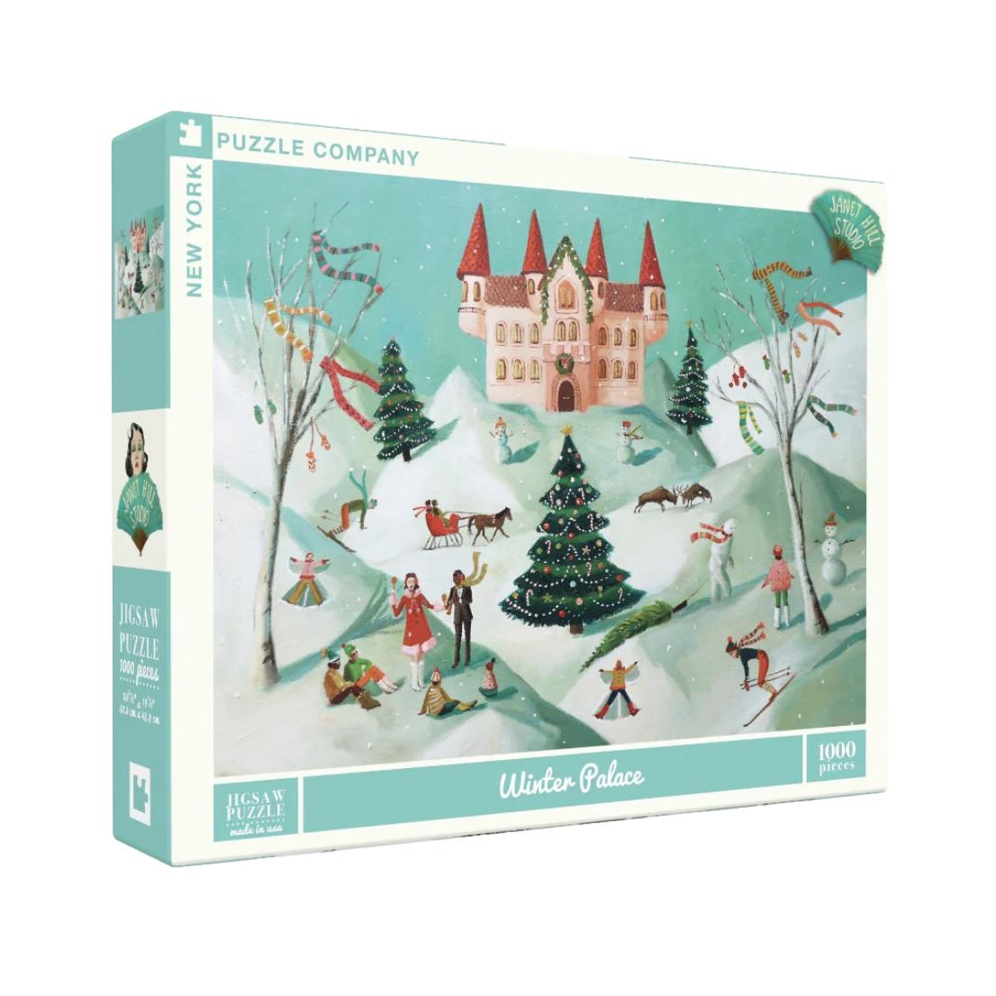 Step into a storybook scene with the Winter Palace 1000 piece jigsaw puzzle, beautifully illustrated by acclaimed artist Janet Hill. This enchanting puzzle captures the magic of the season with a symmetrical winter landscape centered around a majestic palace adorned with festive holiday charm.