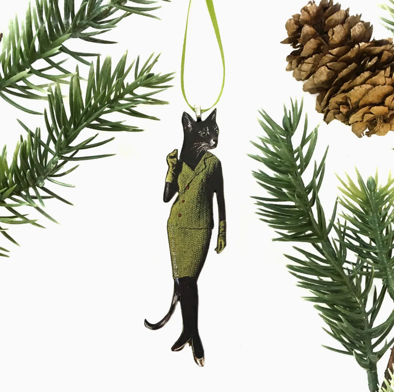 Wooden Collage Christmas Ornament - Retro Cat (in Avocado Dress)