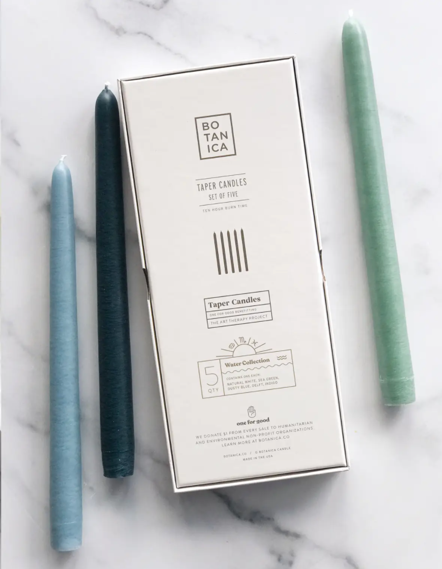 Botanica taper candles are dipped over 20 times by hand, creating the ideal taper–dripless and smokeless–perfect for dinner parties and creating warm, homey ambiance. These Zodiac Tapers are slightly textured for a handmade finish, and beautifully dyed in an array of shades reflecting the Elemental Collection.